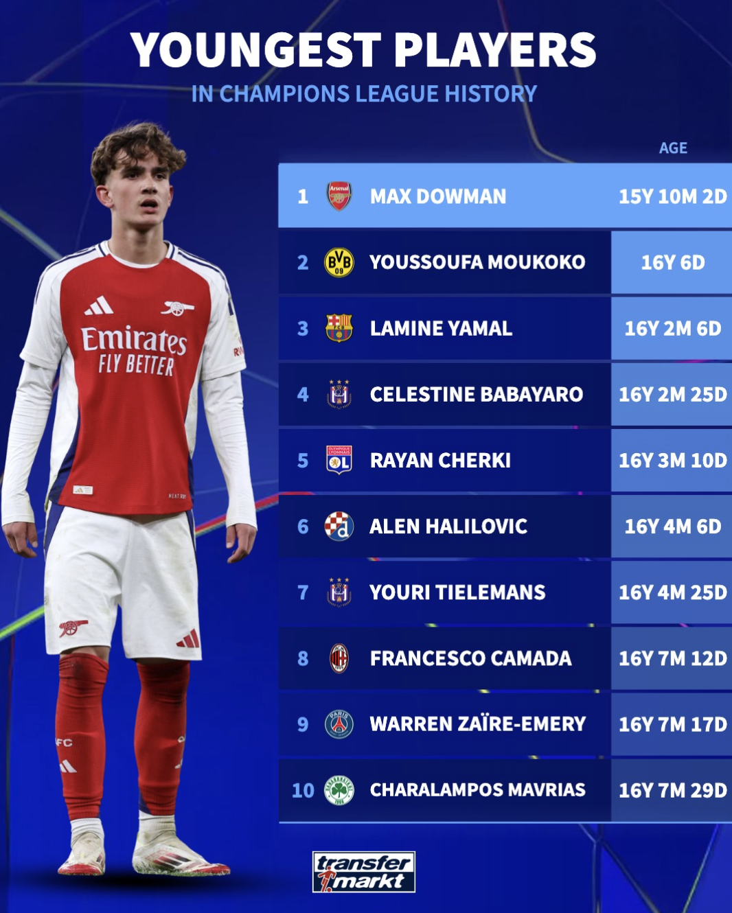 Cầu thủ trẻ Dauman của Arsenal, người vào sân thay người ở vòng này của Champions League, đã vượt qua Mukoko và Yamal để trở thành người giữ kỷ lục mới sau 15 tuổi, 10 tháng và 2 ngày.